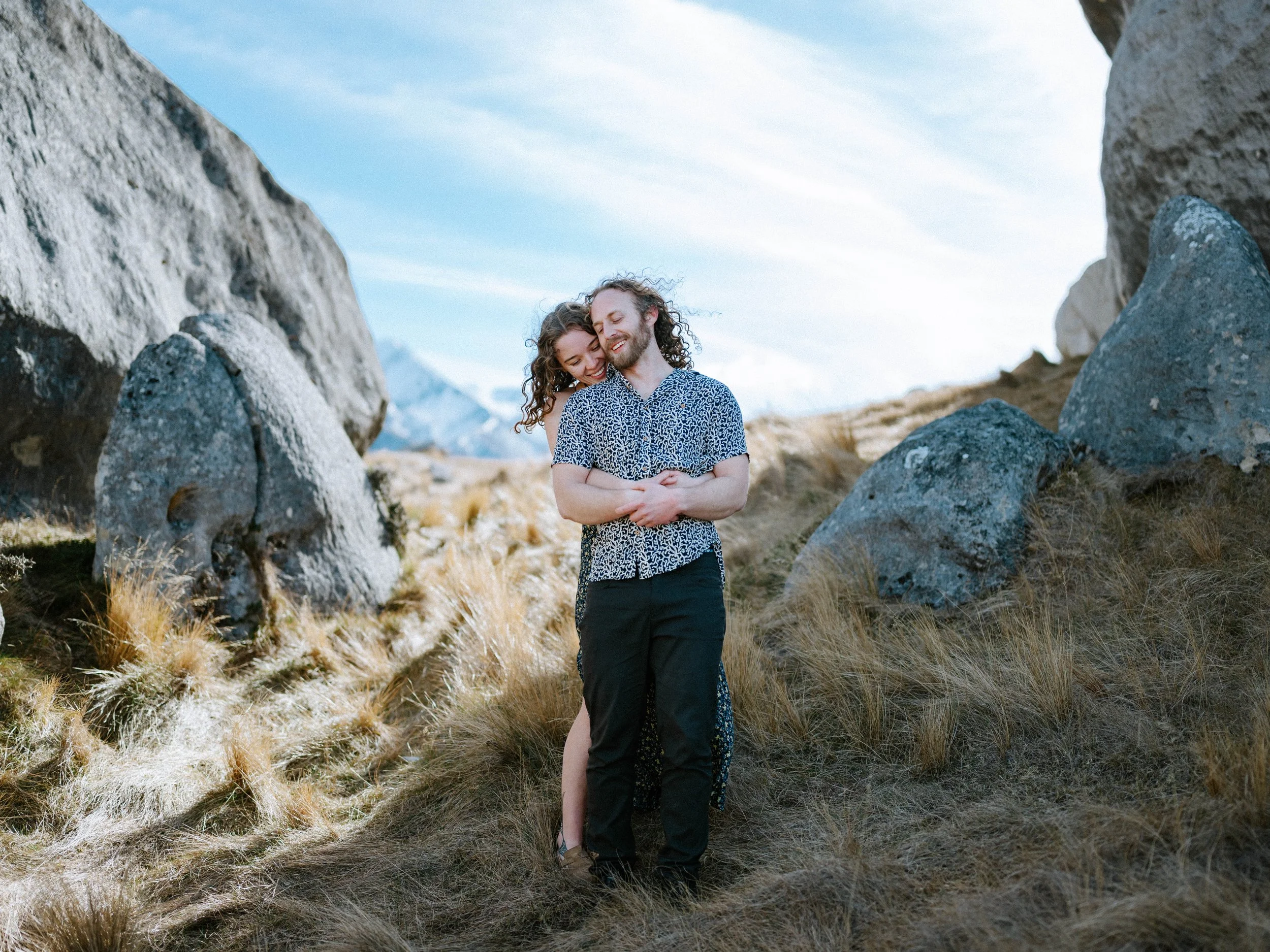 Up amongst the golden tussock and beautiful rock formations of Castle Hill, New Zealand you would usually find Paris & Dominic covered in chalk and clung to the side of a boulder. Though for their pre wedding session…